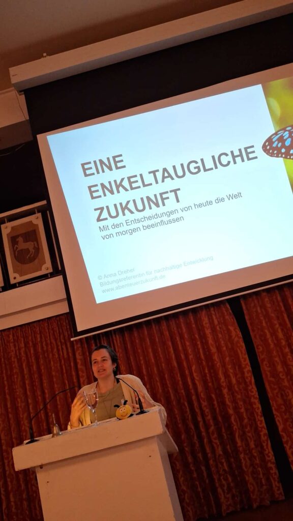 Bildungsreferentin Anna Dreher (https://abenteuerzukunft.de/) erzählte uns viel Neues und auch Bekanntes zum Thema „Eine enkeltaugliche Zukunft – Mit den Entscheidungen von heute die Welt von morgen beeinflussen“.